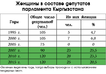 Однако, в 2007 году на референдуме вместе с Конституцией был принят новый закон о выборах, и статья 72 Конституции КР ввела гендерные квоты, квоты для молодежи и национальных меньшинств. Гендерная квота была двухуровневая, с одной стороны количественная – не более 70 процентов лиц одного пола, и с другой – требование к очередности, чтобы было чередование женщин-кандидатов с мужчинами через три кандидата.