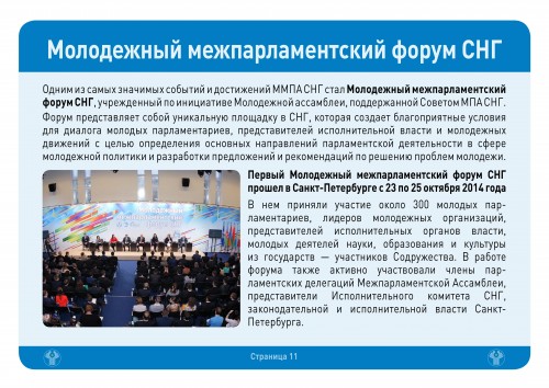 Члены молодежных парламентских делегаций активно участвуют в различных форумах, семинарах и конференциях по молодежной проблематике, а также выступают инициаторами таких мероприятий. Так 23-25 октября 2014 года в Санкт-Петербурге успешно прошел Первый молодежный межпарламентский форум СНГ, учрежденный по инициативе ММПА СНГ. В нем приняли участие около 300 молодых парламентариев, лидеров молодежных организаций, представителей исполнительных органов власти, молодых деятелей науки, образования и культуры из девяти государств — участников Содружества. Модератором одной из секций форума, посвящённой вопросам организации досуга молодежи, выступил депутат Жогорку Кенеш Кыргызской Республики Дастан Далабаевич Бекешев. В работе форума также активно принимали участие сотрудники МИМРД МПА СНГ и представители его филиалов.