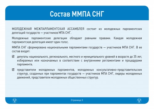 Молодёжная межпарламентская ассамблея СНГ формируется из молодёжных парламентских делегаций государств – участников МПА СНГ, в состав которых входят депутаты национального, регионального, местного и муниципального уровней в возрасте, как правило, до 35 лет, а также представители молодежных парламентов, молодежных консультативно-представительских структур, созданных при парламентах государств – участников МПА СНГ, лидеры молодежных движений и общественных организаций.