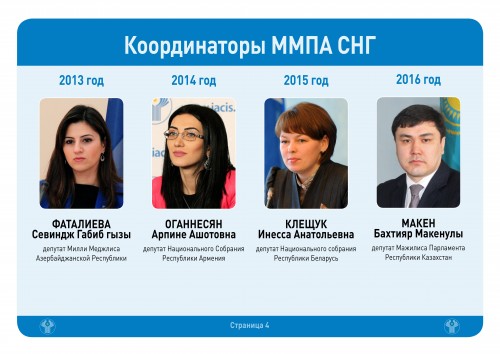 С апреля 2016 года Координатором ММПА СНГ является депутат Мажилиса Парламента Республики КазахстанБахтияр Макенулы Макен. Согласно утвержденному плану работы Межпарламентской Ассамблеи государств – участников СНГ очередное девятое заседание Молодёжной межпарламентской ассамблеи государств – участников СНГ (ММПА СНГ) пройдет в июне 2017 года в Чолпон-Ате на полях ежегодного международного форума «Дети Содружества». На этом заседании состоится передача полномочий Координатора ММПА СНГ представителю молодёжной парламентской делегации Кыргызской Республики.