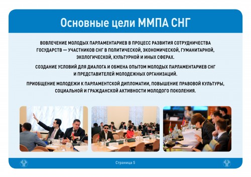 Основные цели ММПА СНГ – вовлечение молодых парламентариев в процесс развития сотрудничества государств – участников СНГ, создание условий для диалога и обмена опытом молодых парламентариев и представителей молодежных организаций, приобщение молодежи к парламентской дипломатии, повышение правовой культуры, социальной и гражданской активности молодого поколения Содружества.